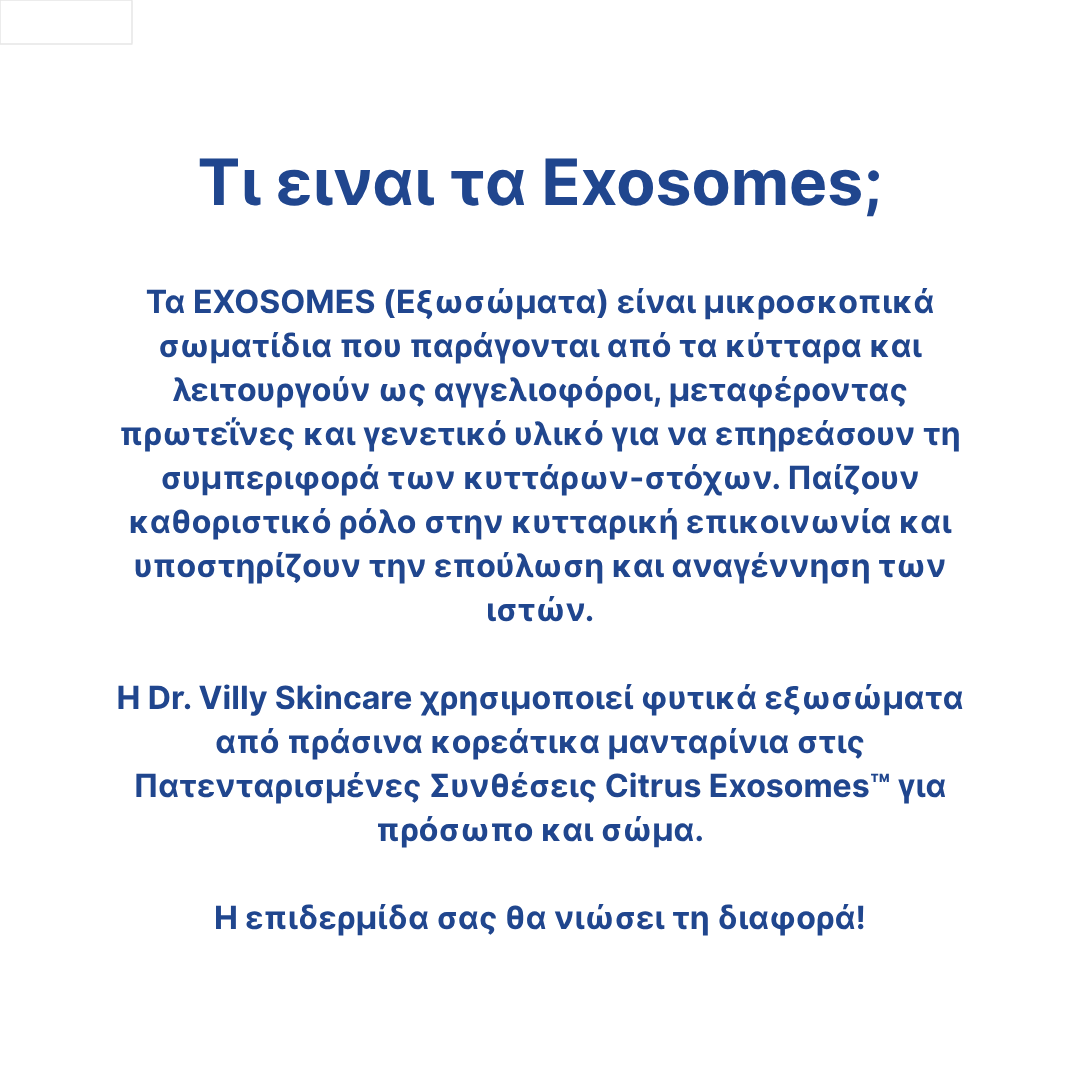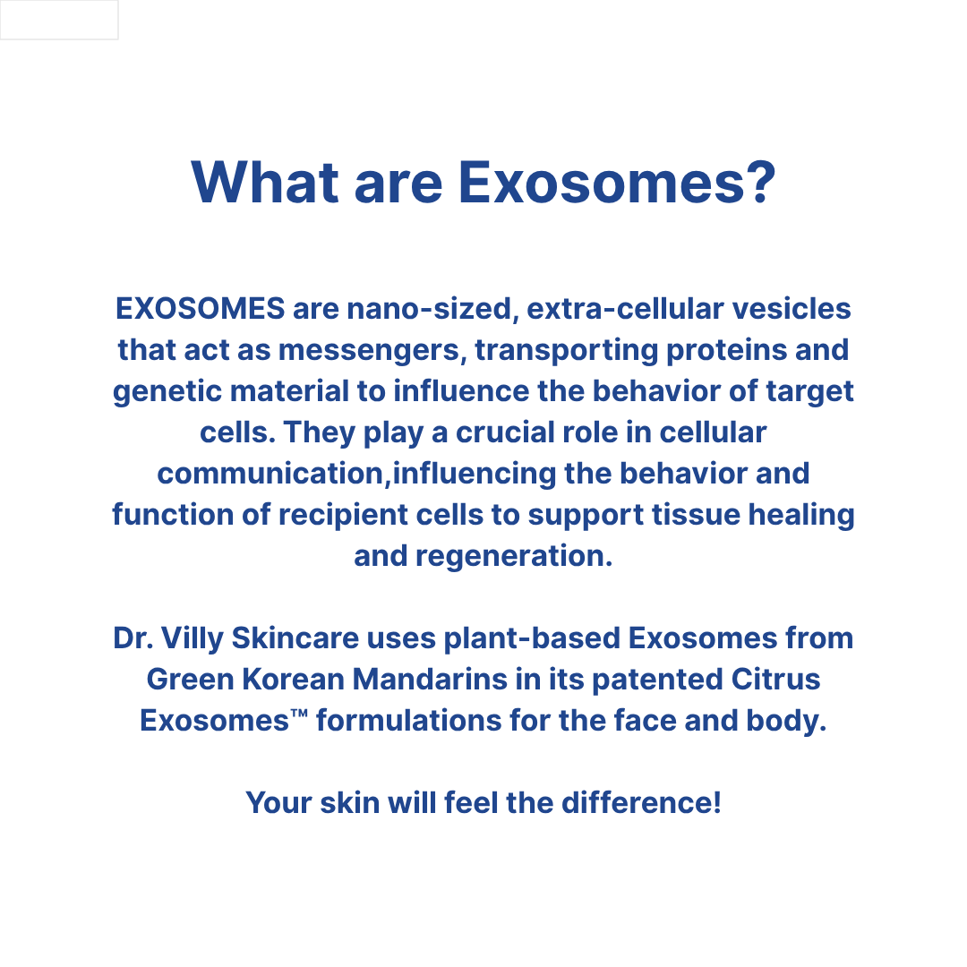 Exosomes are signaling molecules that facilitate intercellular communication and influence cell function. Dr. Villy's CITRUS EXOSOMES are derived from green Korean tangerines, they reduce wrinkles and provide elasticity and hydration by increasing elastin and hyaluronic acid levels.